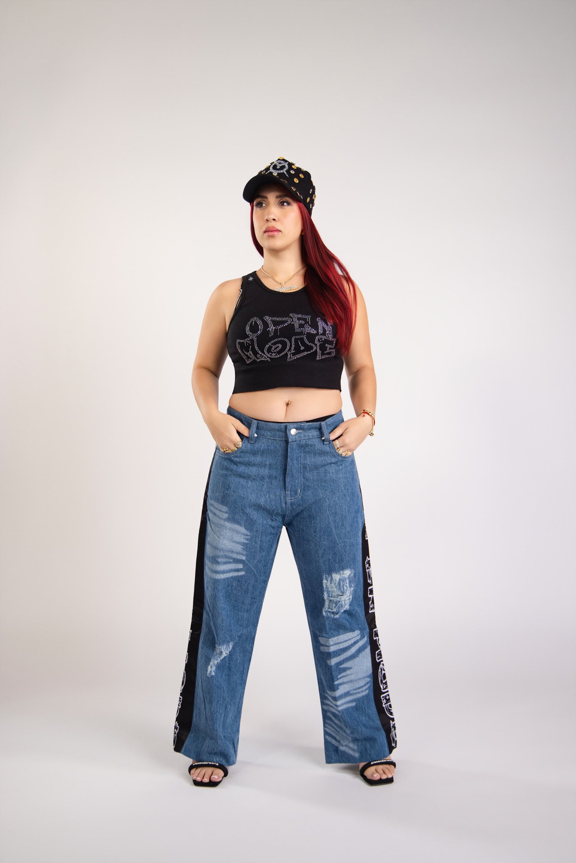 Este pantalón de mujer O.M, marca Open Mode, es perfecto para la mujer moderna y urbana. Hecho de mezclilla, con una elegante franja negra en los lados, su estilo ancho te permite moverte con comodidad y lucir a la moda. ¡Hazte ya con el tuyo y deslumbra con un look único!